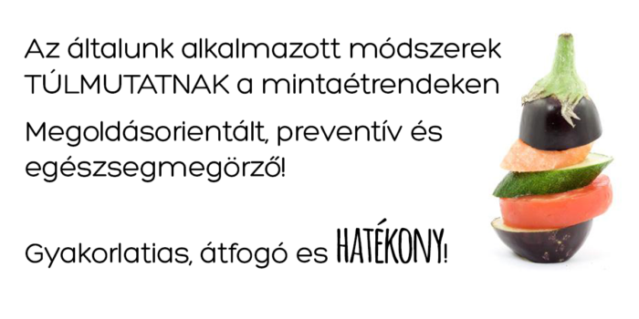 Táplálkozás-Beállítás névre keresztelt módszerünk az egyéni sajátosságok figyelembe vételével kialakított, személyre szabott étrend, ahol egy különlegesen felépített ismeretanyag segítségével egy életre szóló tudást és eszköztárat nyújtunk át az egészségük iránt elkötelezetteknek. „Rávilágítunk az apró, de fontos különbségekre és arra, hogy milyen lépések vezetnek el Téged a szervezeted igényeinek megfelelő, egészséges táplálkozáshoz….” Avagy hogyan tudod felépíteni személyes étrendedet… amely aztán megvalósítható a mindennapokban.